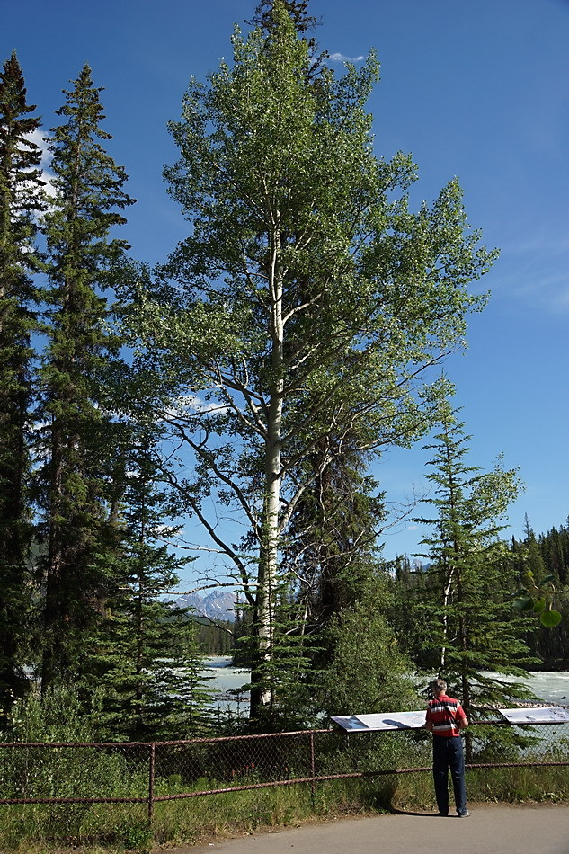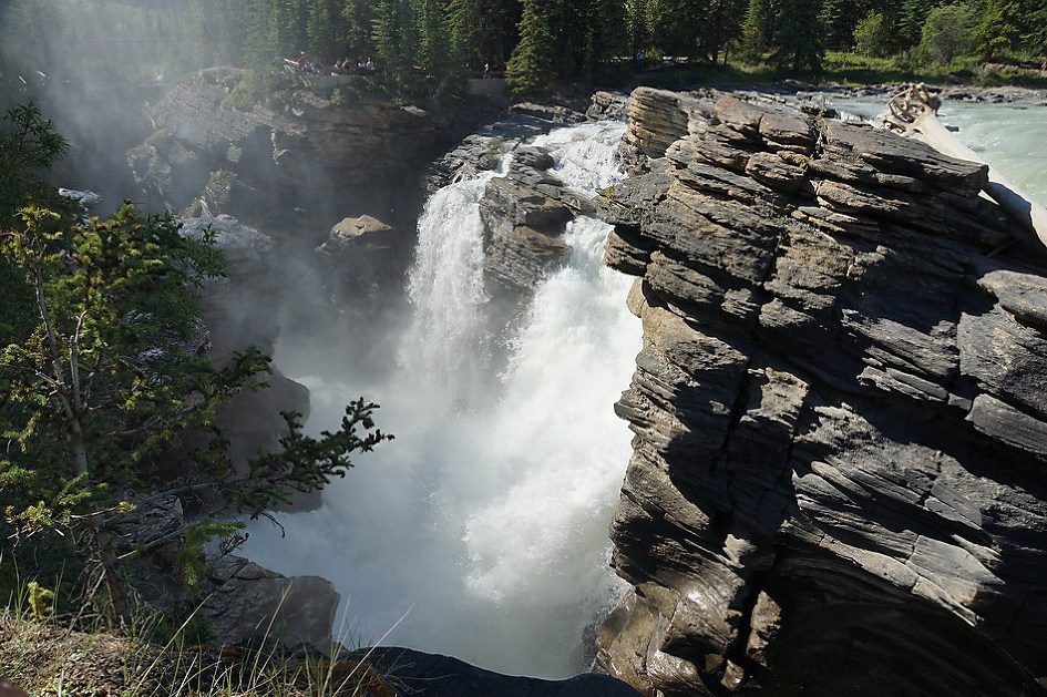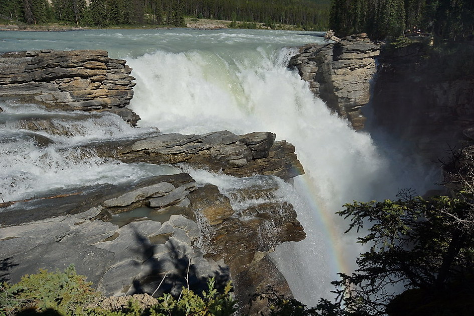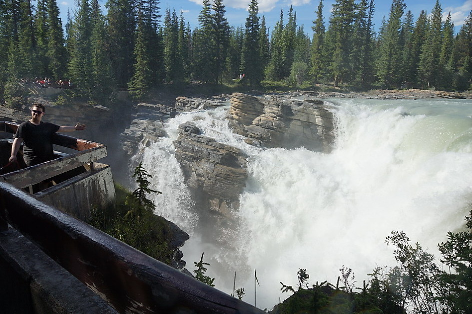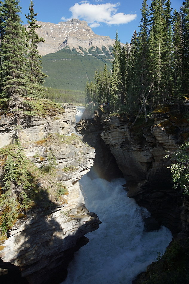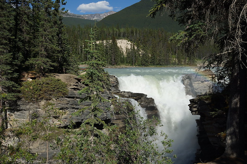 선웝터 폭포에서 20여 분을 가면 애서배스카 폭포 근처에서 아이스필드 파크웨이(#93)가 갈라지는 데 폭포는 좌회전하여 구도로인 93A를 타야 한다. 애서배스카 폭포는 애서배스카 강에 의해 생긴 높이 22m 폭포로 섭웝터 폭포와 주변 산이나 폭포의 위치 등이 비슷하나 수량과 규모가 훨씬 큰 폭포로 양측 전망대에서 전망을 해야 하고 좁은 협곡 길을 따라 가면 타임 터널(Time Tunnel)이 있으며 양쪽 산책로를 다 둘러봐야 함.