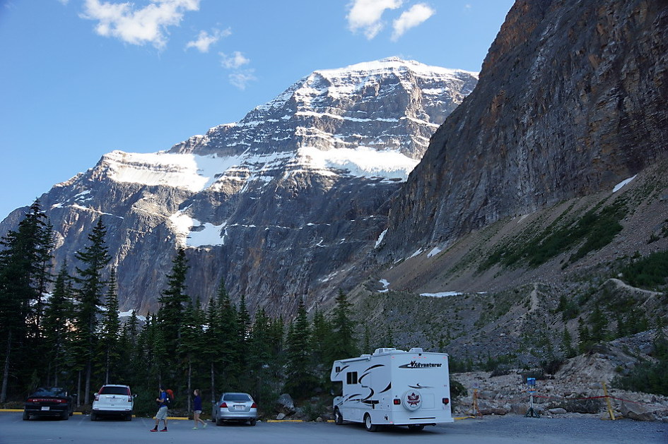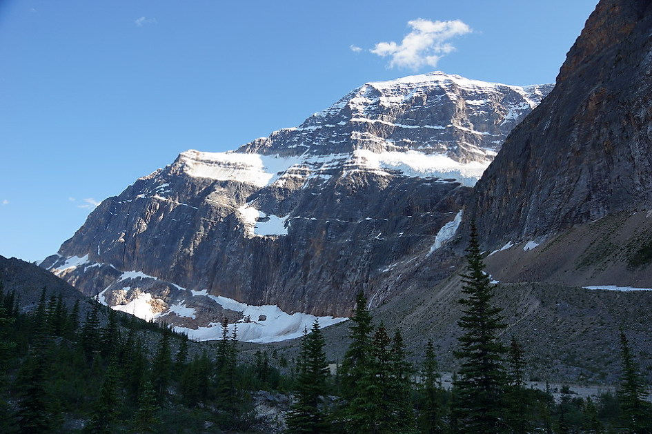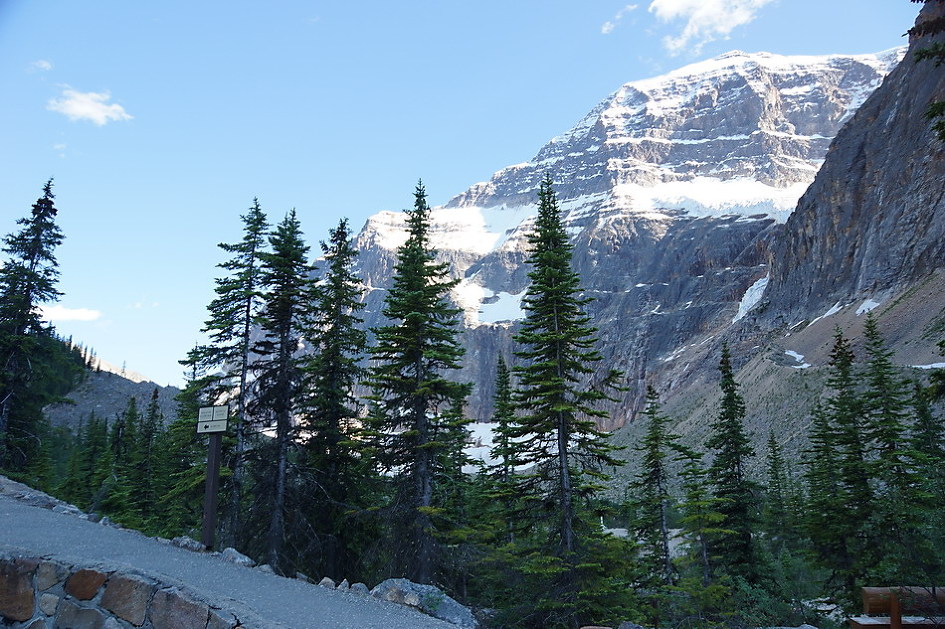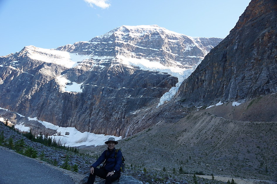 애서배스카 폭포에서 재스퍼로 갈 경우는 93A South를 지나 93번 도로를 타야 하나 에디스카벨 산을 가기 위해서는 93A North 쪽으로 가야 한다. 이도로를 20분 정도 달리면 에디스카벨 도로의 진입로가 나오는 데 갈림길 직전의 표시 이외는 아무런 표시도 없는 도로를 반신반의하며 남쪽으로 30분 정도 달리면 주차장에 도착한다. 캐나다의 도로 주행이나 하이킹시 안내 표시판의 특징은 목표지점까지는 중간에 몇 km가 남았다는 친절한 안내판은 아예 없다. 에디스카벨 산(3363m)의 엔젤 빙하는 산의 북사면에 걸쳐있는 빙하로 그 모습이 마치 천사가 날개를 펴고 있는 것 같다고 하여 엔젤 빙하라고 하는데