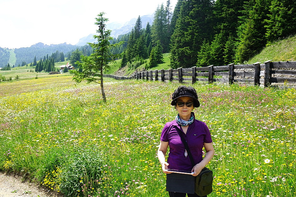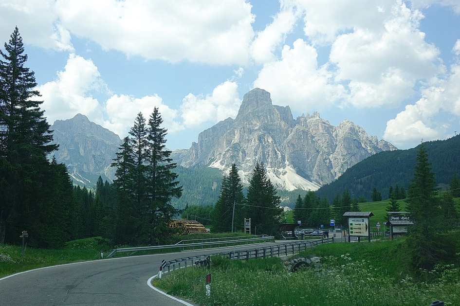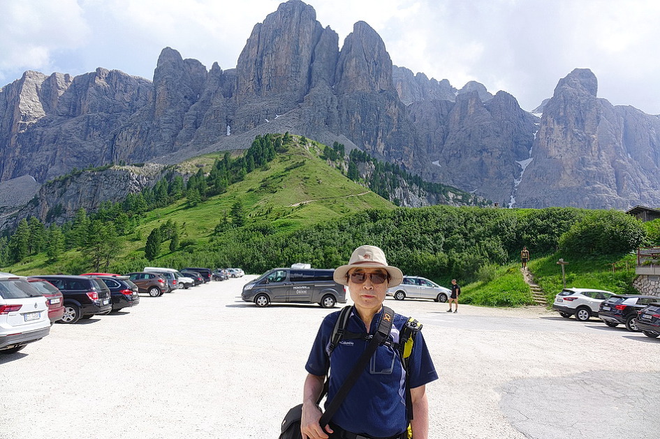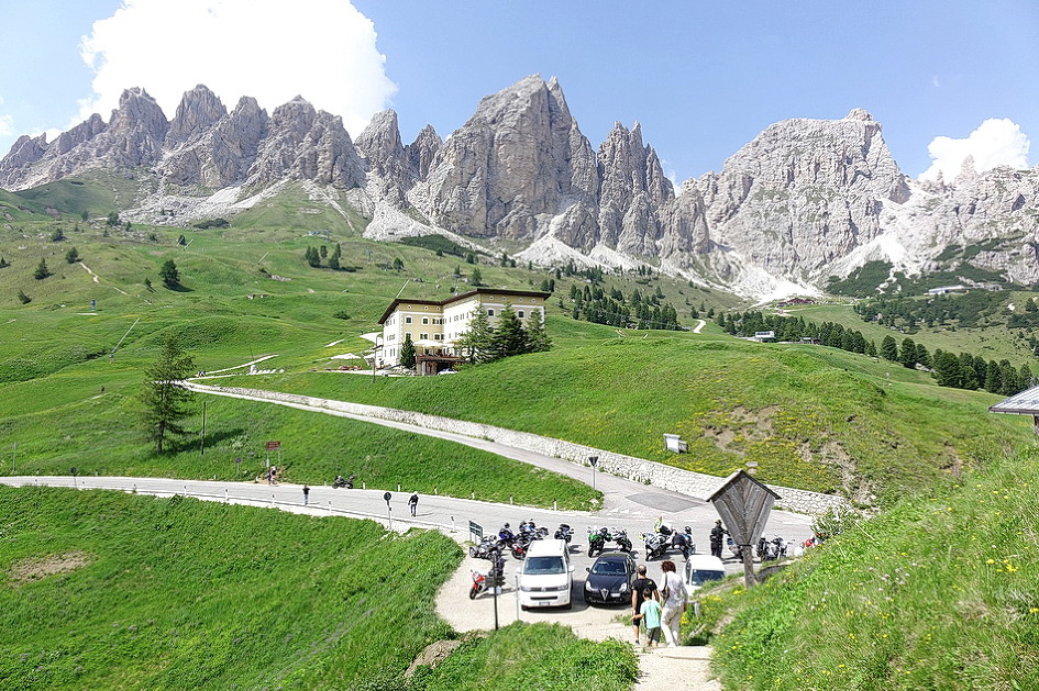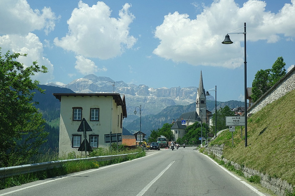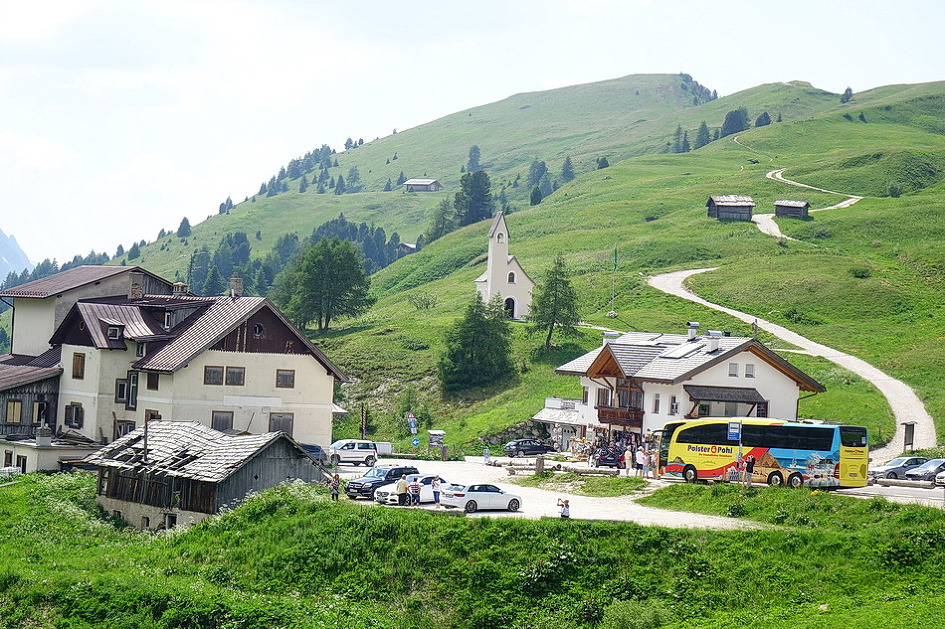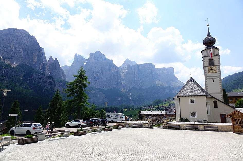 Passo Falzarego에서 Rifugio Lagazuoi(2762m)관광을 포기하고 Passo Valporola-La villa- Corvara를 거쳐 콜포스코(Calfosch) 교회에 도착하려고 구글 내비에 콜포스코를 입력한 후에 가다보니, Arabba-Passo Campolongo-Corvara코스로 안내를 해서, 코르바라 도착 직전에야 사진에서 본 유명한 돌로미티 산악 자전거의 헤어핀 코스가 나타나서 잘못 안내를 받았다는 것을 알았다. 특히 일요일에 San Vito Cadore에서 코르티나 담페초를 경유하여 Pecol-Passo Falzarego-Arabba까지 가는 구간은 차량, 오토바이, 산악 자전거들이 일시에 몰려들어, 잠시 차를 정차하고 쉴만한 공간들이 없고, 계속되는 헤어핀 코스들과 꼬리에 꼬리를 무는 차량의 흐름에 맞추려고 주행하다 보니 이때에 찍은 사진들이 하나도 없었다. 아내도 긴장되고 신경이 쓰여서 사진을 찍지