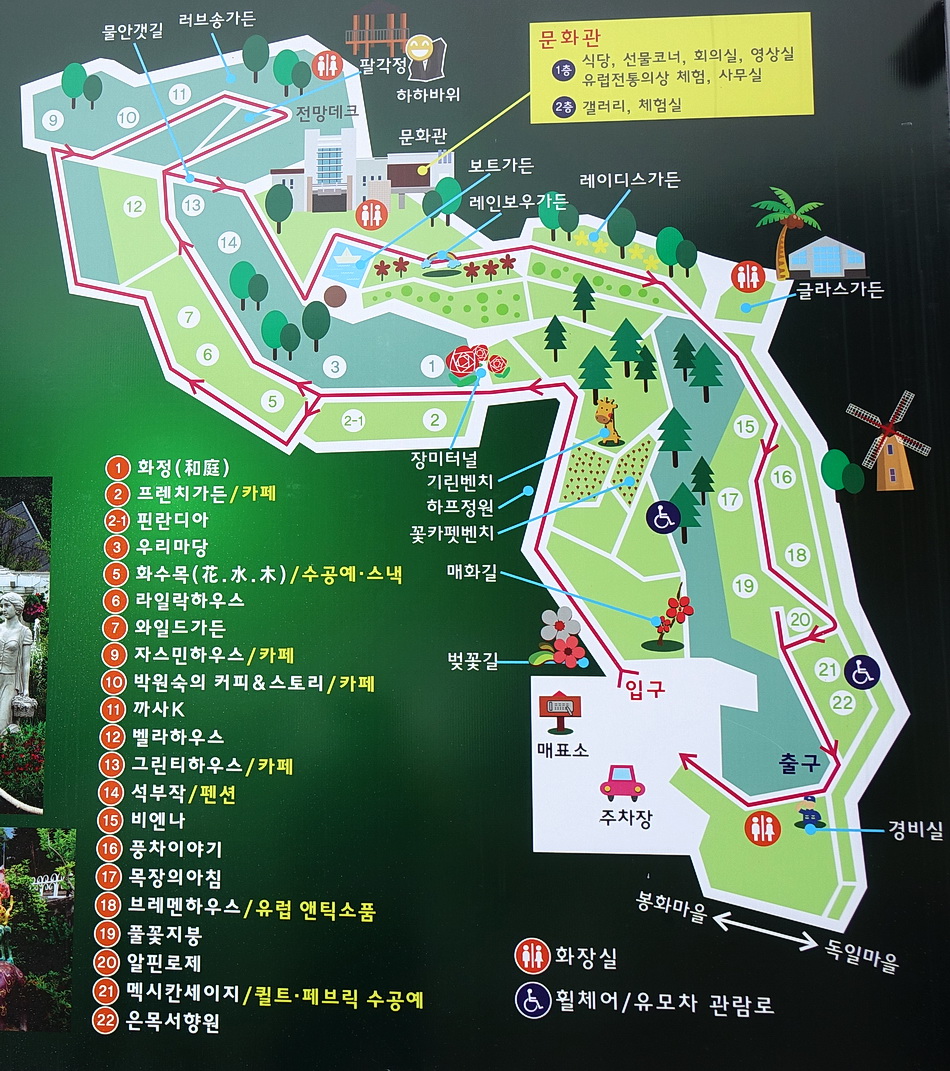 십여 년 전에 2~3번 정도 이곳에 와서 독일마을과 박원숙 씨가 사는 집도 가봤었는데 이번에 가보니 지형지물이 완전히 바뀌어져 있었다. 이곳은 부지가 넓고 볼거리와 쉴 곳이 많아서 나중에 서울에서 손자들이 내려오면 꼭 데려오고 싶은 곳이었다.