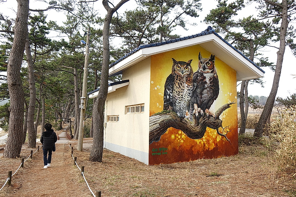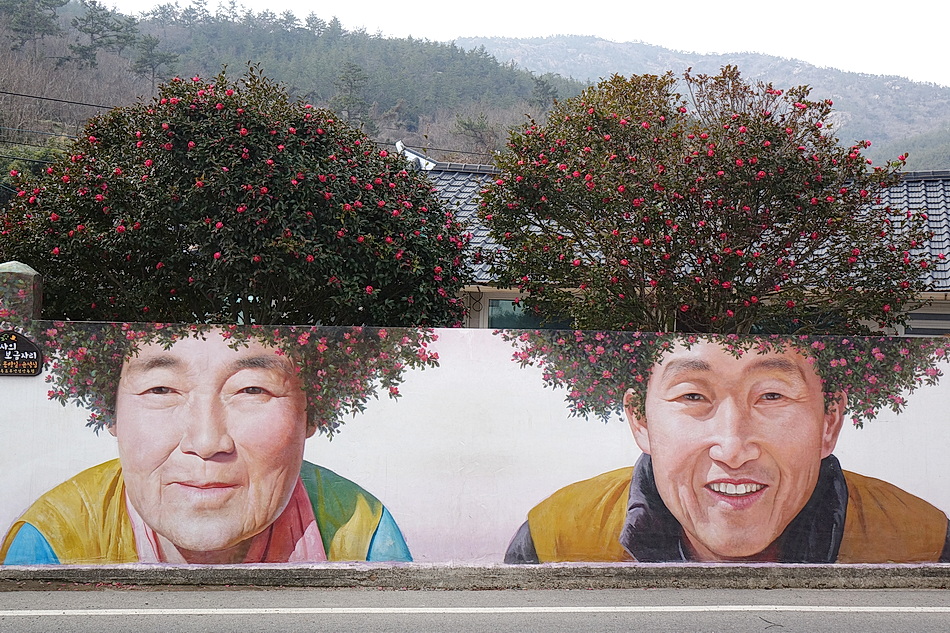 암태도의 기동 삼거리에 있는 김지안 작가의 유명한 동백 파마머리 벽화. 그리고 자은도의 유각 마을 입구에도 같은 작가의 여러 인물들의 벽화가 있었으나 시간에 쫓기어 찍지 못했다.