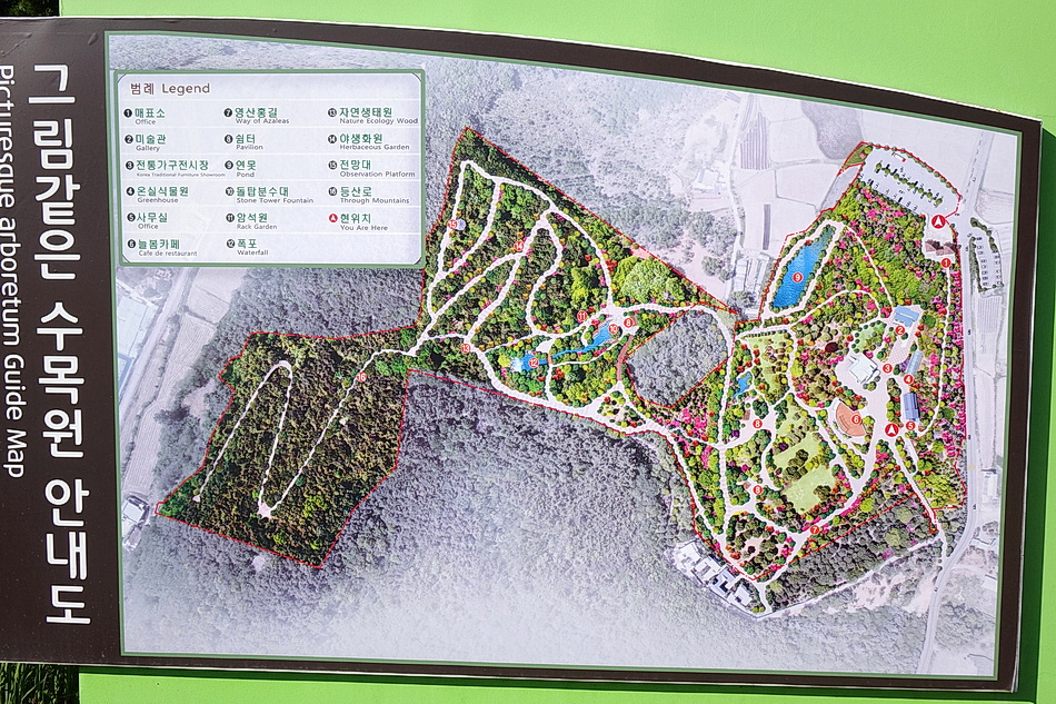 고운식물원을 구경하고 집으로 가는 도중에 오랜만에 광천읍에 있는 그림이 있는 정원에 가보기로 하고 내비에 입력을 해봐도 그림 같은 수목원으로 개명을 해서 그런지 검색이 잘 안 되었다. 그림 같은 수목원은 TV 인간극장에서 방영해서 많이 알려진 곳으로 고인이 되신 아버지가 장애가 있는 아들을 위해 수십 년에 걸쳐 조성한 수목원이다. 봄꽃들이 만개할 때에는 아주 멋진 곳인데 시기가 너무 지나서 봄꽃들은 없었으나 산책할 겸 대충 둘러보았다. 한 가지 아쉬운 점은 주 관람로 등을 안내하는 표시가 없어서 동선을 정하기가 어려웠다.