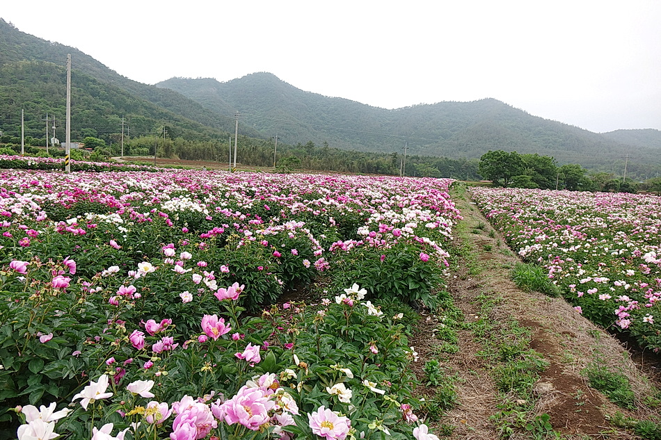 선학동 유채꽃을 구경하며 산책 후에 집으로 가는 도중에 장흥군 용산면 상금리 산 61-1에 있는 작약꽃(함박꽃)을 보러 갔는데 전날 내린 폭우로 상한 꽃잎들이 조금 많았다. 그러나 항상 함박꽃을 보면 꽃이 크고 색깔이 다양하고 화려해서 다른 꽃들보다 더 애착이 가는데, 특히 아내에게 어린 시절에 희망을 줬던 꽃이라 더욱더 정이 가는 꽃이다.