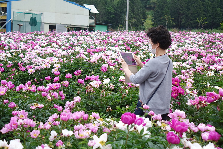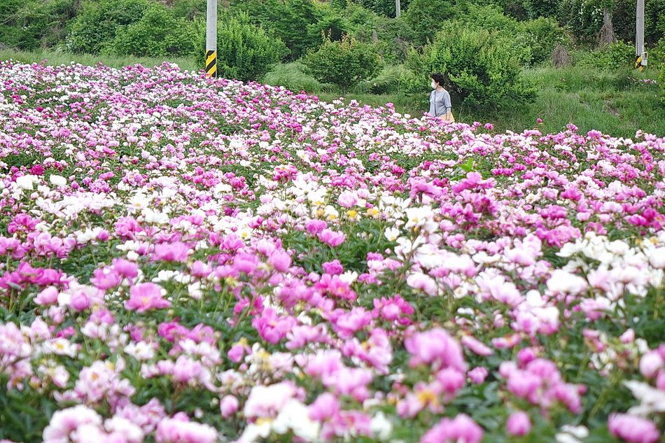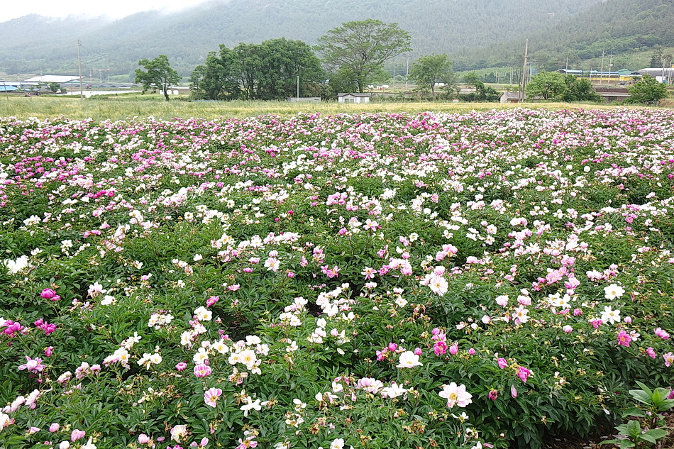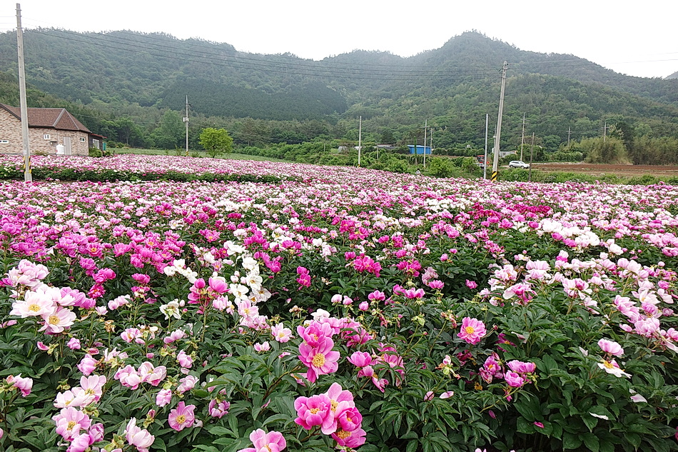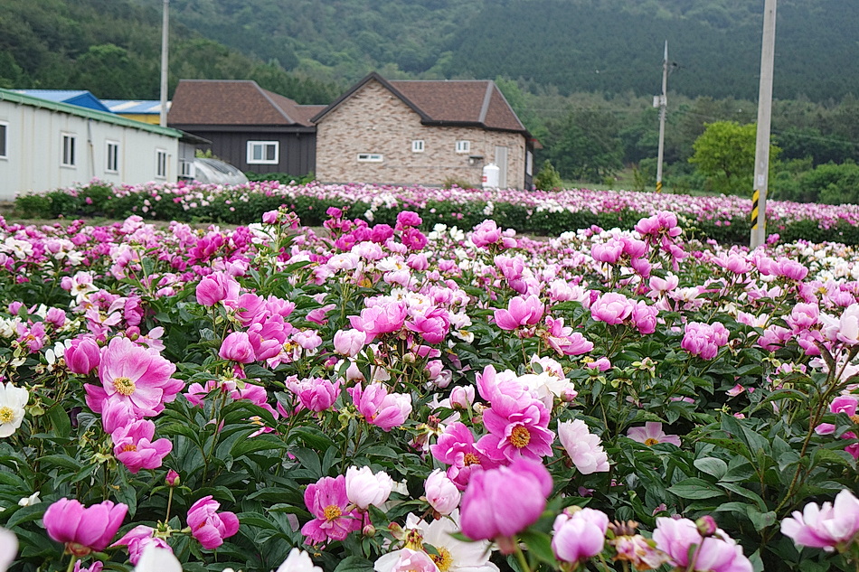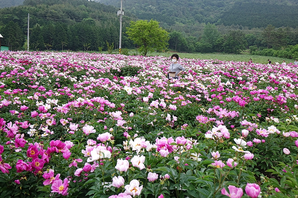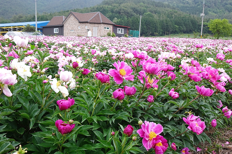 선학동 유채꽃을 구경하며 산책 후에 집으로 가는 도중에 장흥군 용산면 상금리 산 61-1에 있는 작약꽃(함박꽃)을 보러 갔는데 전날 내린 폭우로 상한 꽃잎들이 조금 많았다. 그러나 항상 함박꽃을 보면 꽃이 크고 색깔이 다양하고 화려해서 다른 꽃들보다 더 애착이 가는데, 특히 아내에게 어린 시절에 희망을 줬던 꽃이라 더욱더 정이 가는 꽃이다.