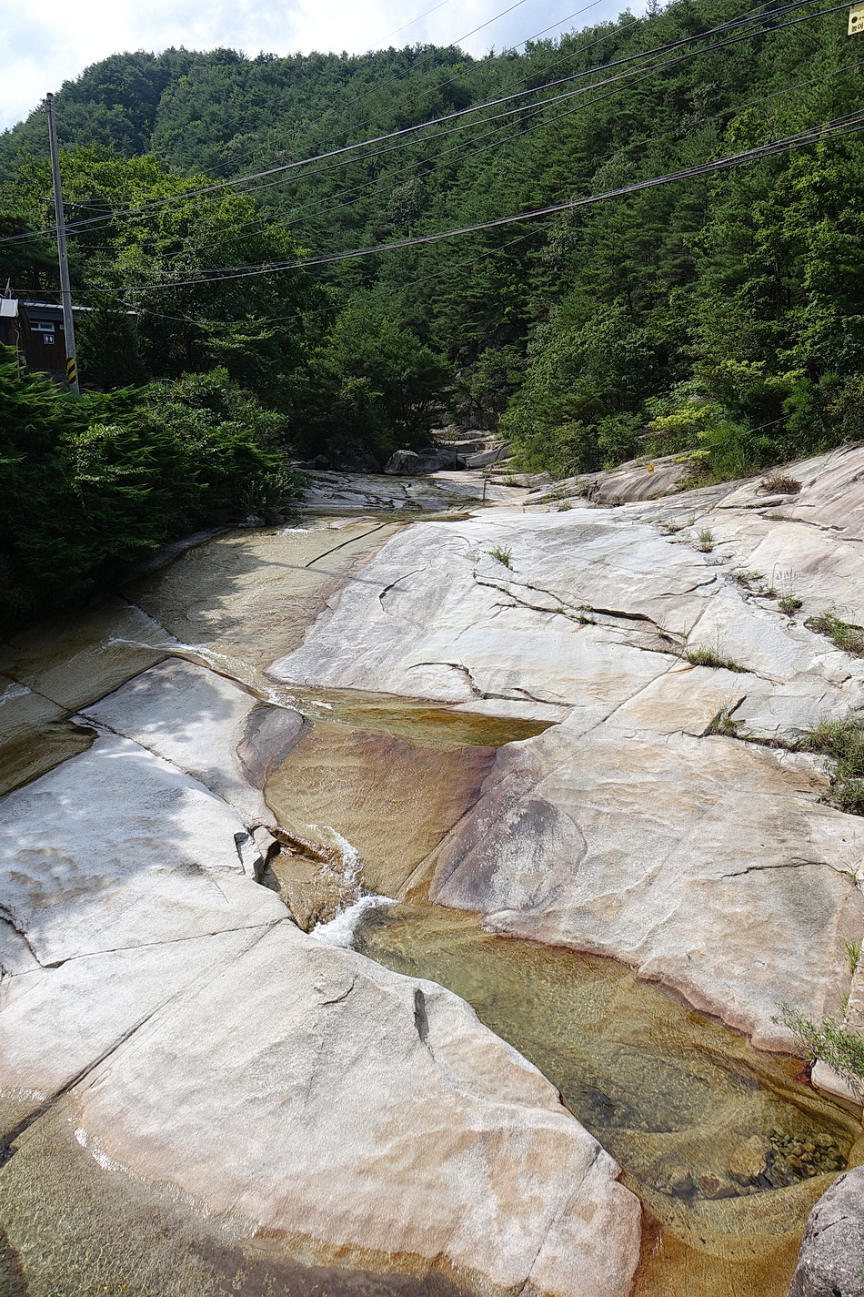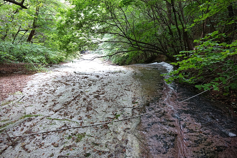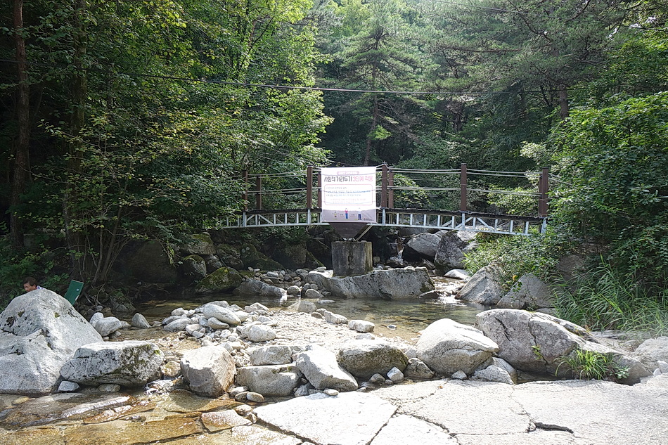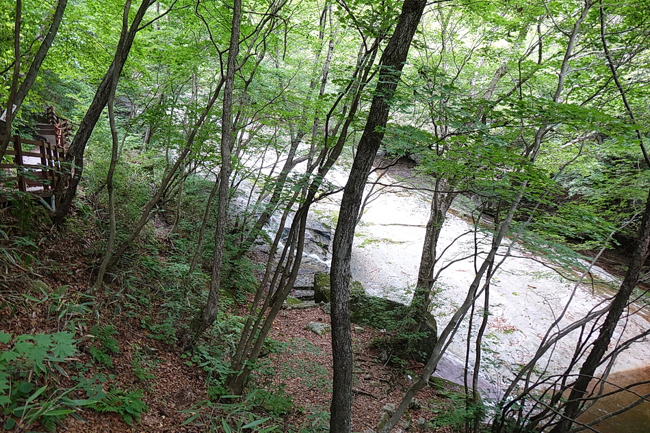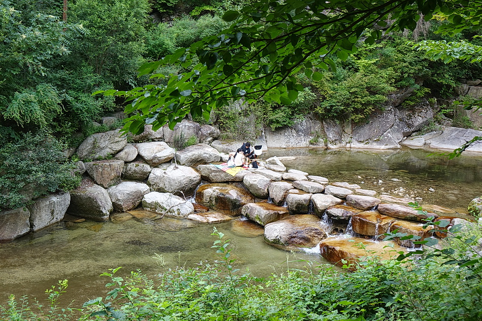 가운데에 있는 너럭바위가 매트를 깔기 좋는 곳으로 매년 이곳에서 쉬는데 작년에는 홍수로 이 바위가 물에 잠겨 다른 곳에서 쉬어야 했다.