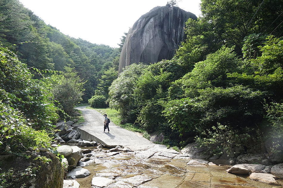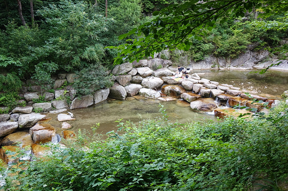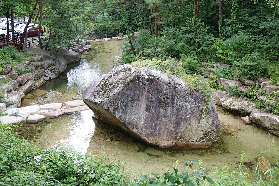 가운데에 있는 너럭바위가 매트를 깔기 좋는 곳으로 매년 이곳에서 쉬는데 작년에는 홍수로 이 바위가 물에 잠겨 다른 곳에서 쉬어야 했다.