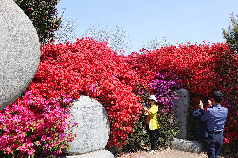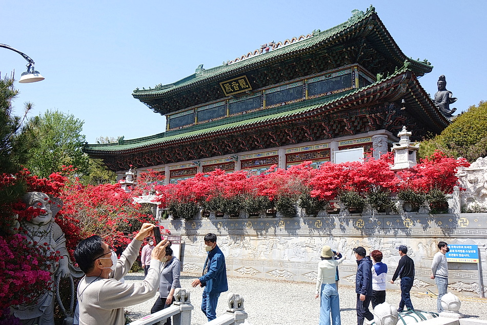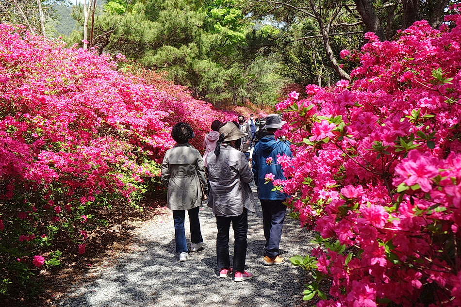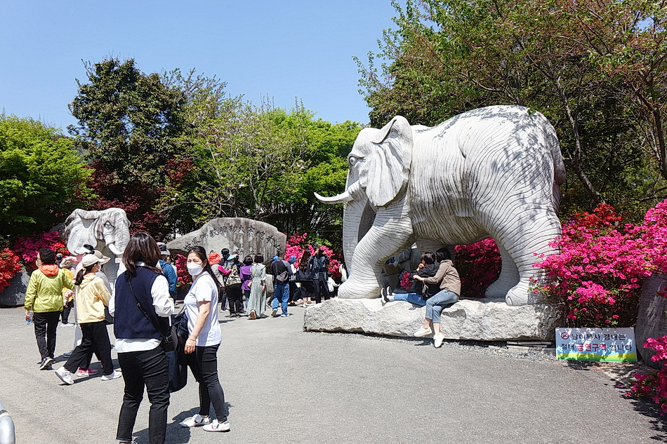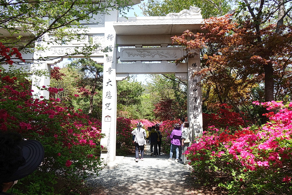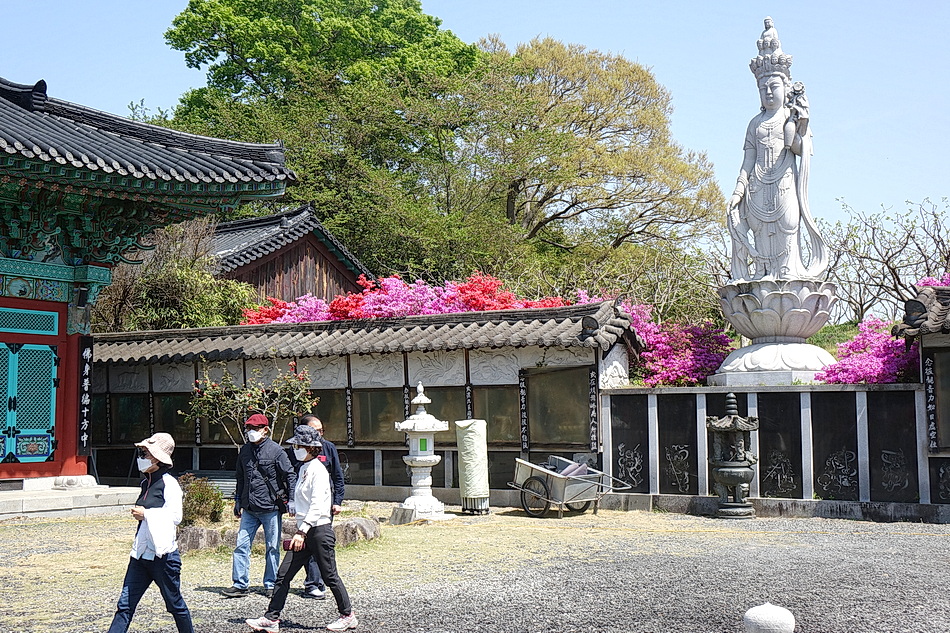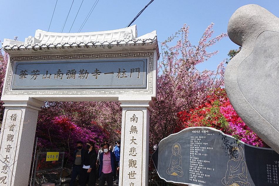 작년에 강진 남미륵사의 서부해당화 꽃의 만개 시기를 놓쳐서 올해에는 꼭 만개한 서부해당화 꽃을 보려고 남미륵사를 향해가는데 절 1km 전방부터 엄청난 차량들이 몰려서 주차장에 도착하는데만 1시간 이상의 시간이 소요되었다. 몇 년 만에 처음인 심한 체증과 엄청난 인파들을 경험하였다. 남미륵사는 좀 특이해서 미로처럼 다양한 색깔의 철쭉꽃 울타리로 만들어진 좁은 관람로를 따라 일방통행으로만 갈 수 있어서 인파에 시달려서 되돌아 나오고 싶어도 되돌아 나올 수가 없는 구조였다. 보고 싶었던 일주문 근처의 서부해당화 꽃들은 이미 절정을 지나 꽃들이 퇴색되었고 많이 떨어져 본래의 자태를 잃어버렸었다. 취향에 따라 다르겠지만 다시는 가고 싶지 않은 곳이었다.
