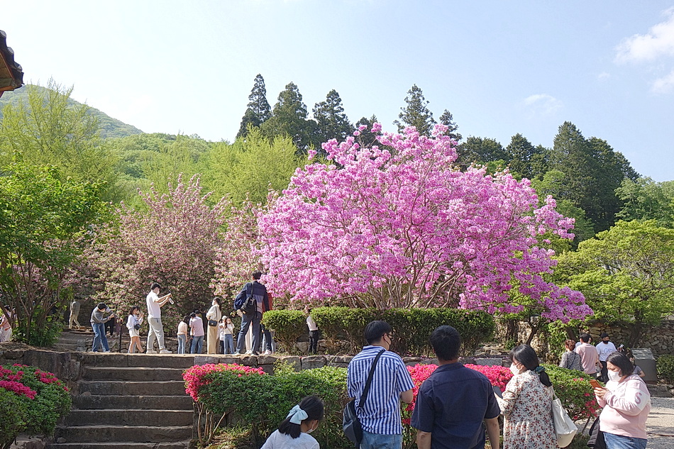 몇 년 만에 선암사의 겹벚꽃을 보려고 가는데 많은 차량들이 몰려서 주차를 하는데 상당한 시간을 소비했다. 매 년 가는 때보다 1주일이 늦어서 겹벚꽃이 절정을 지나지 않았을까 우려했는데 예상대로 이미 때를 지나 잎이 무성하게 자랐고 꽃들도 벌써 퇴색하여 본래의 빛깔을 잃어버린 상태였다. 오직 자산홍만이 본래의 자태를 뽐내고 있었다. 코로나 시대에 한 가지 장점은 많은 인파가 몰려있어도 마스크 때문에 사진을 찍는데 부담이 적다는 것이다.