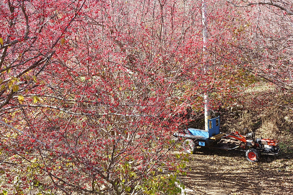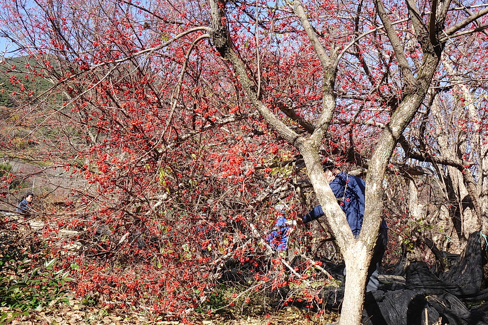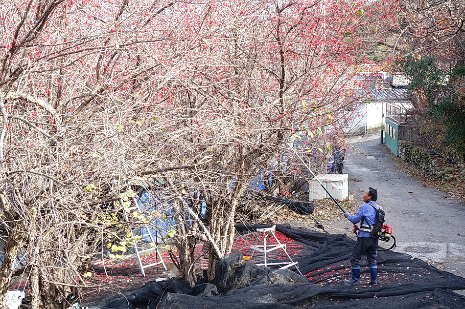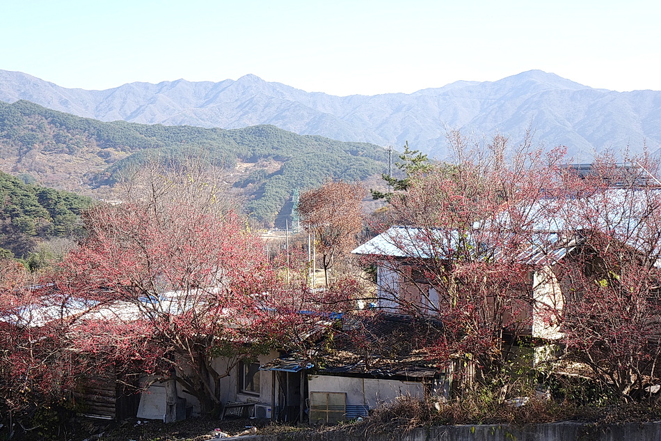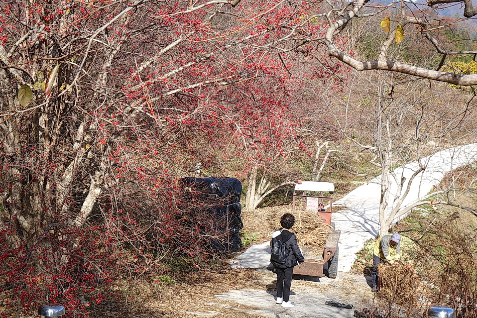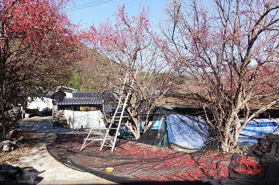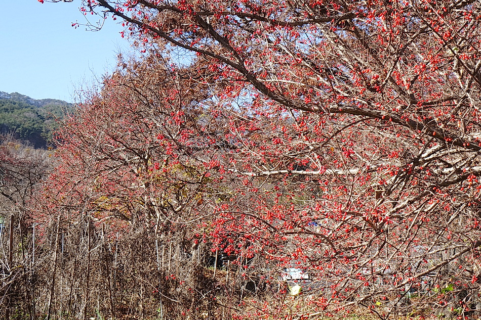현천마을은 우리 부부가 산책을 하기 위해 자주 가는 곳인데 이때쯤에는 붉은 산수유 열매를 한창 수확하는 시기이다. 천천히 마을을 둘러보면서 산수유를 수확하는 여러가지 방법을 볼 수 있었고 멀리 지리산 연봉들의 조망도 좋았다.